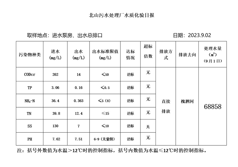 北山污水处理厂水质化验日报(2023.9.2)