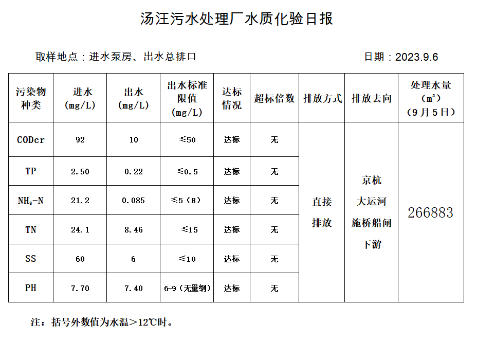 汤汪污水处理厂水质化验日报(2023.9.6)