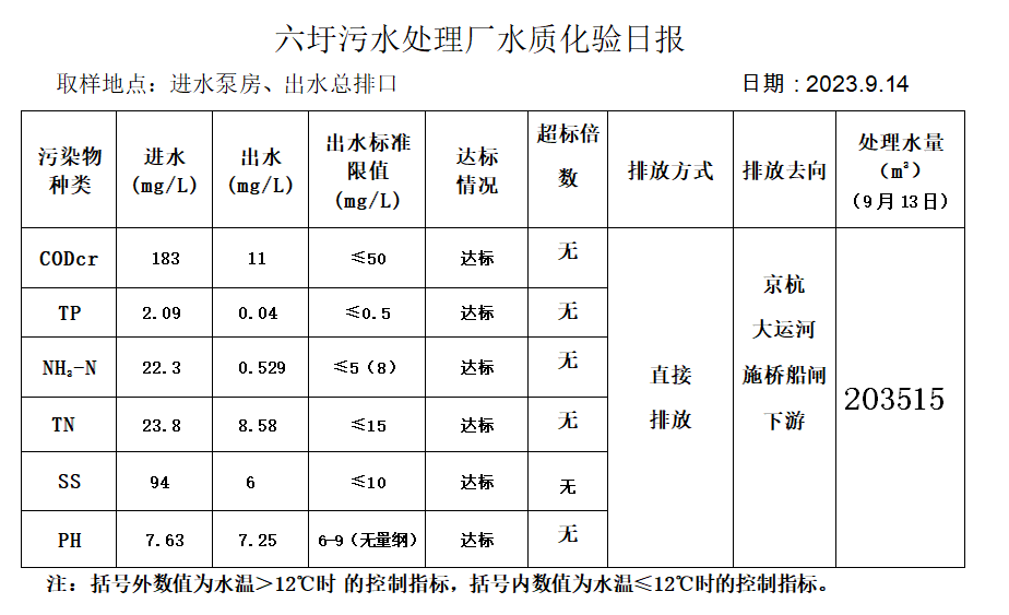 六圩污水处理厂水质化验日报(2023.9.14)