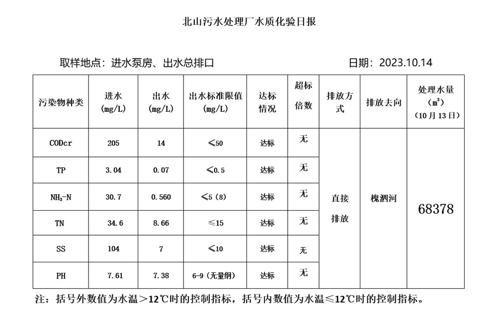 北山污水处理厂水质化验日报(2023.10.14)