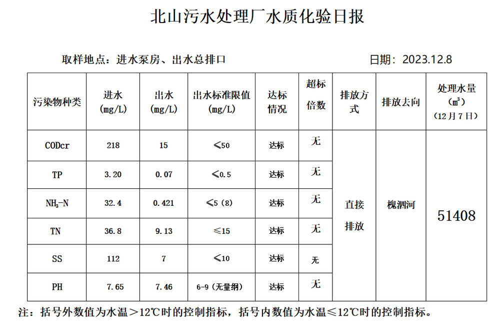 北山污水处理厂水质化验日报(2023.12.8)