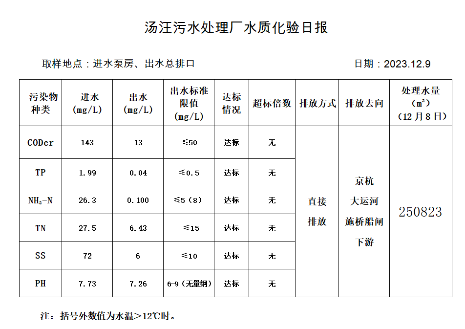 汤汪污水处理厂水质化验日报(2023.12.9)