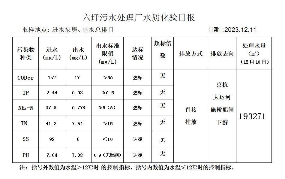 六圩污水处理厂水质化验日报(2023.12.11)
