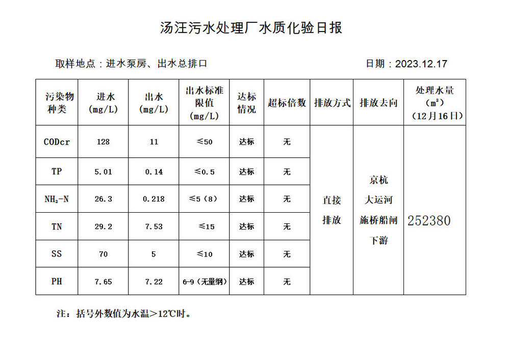 汤汪污水处理厂水质化验日报(2023.12.17)