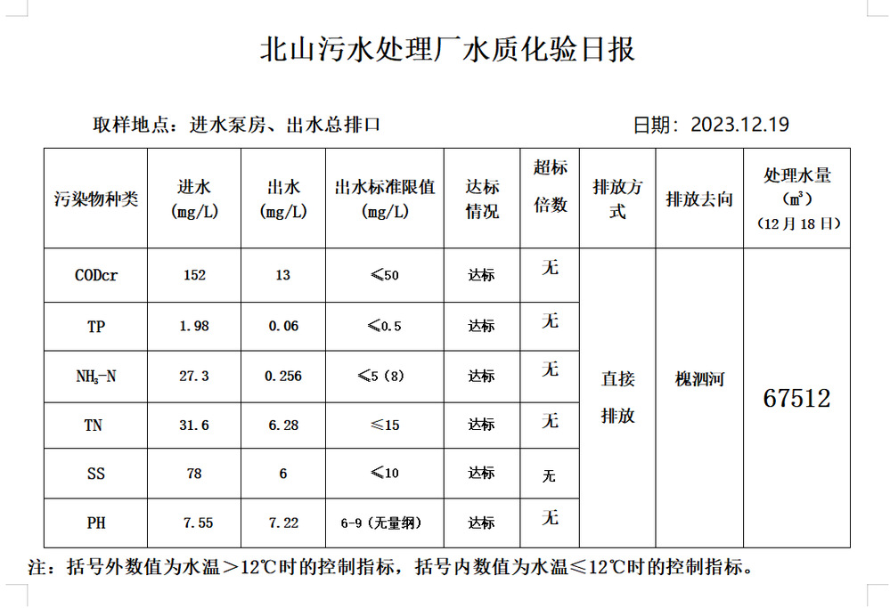 北山污水处理厂水质化验日报(2023.12.19)