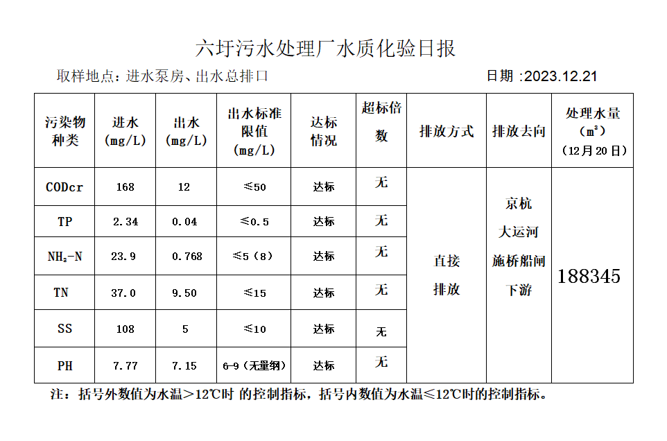 六圩污水处理厂水质化验日报(2023.12.21)