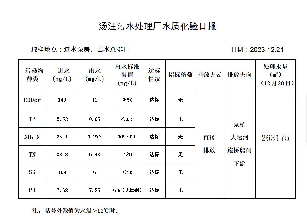 汤汪污水处理厂水质化验日报(2023.12.21)