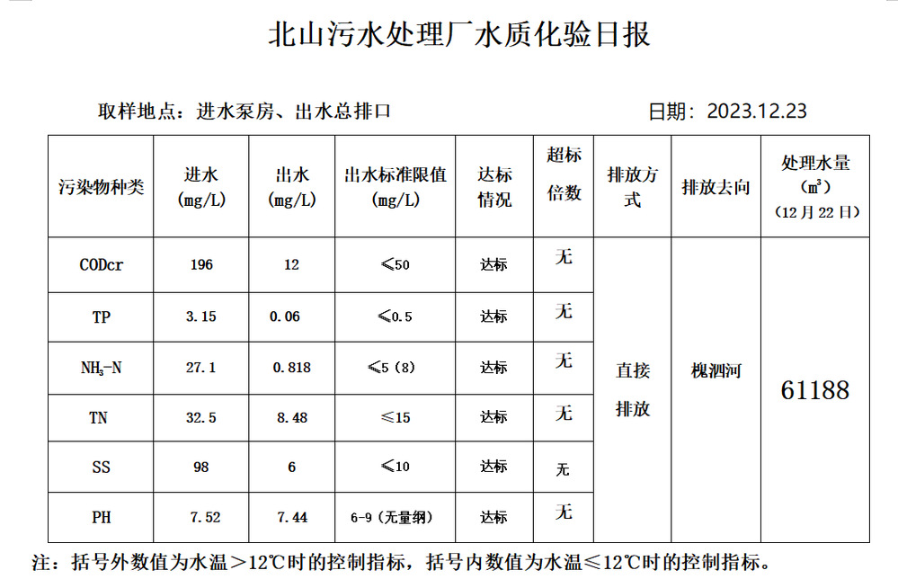 北山污水处理厂水质化验日报(2023.12.23)