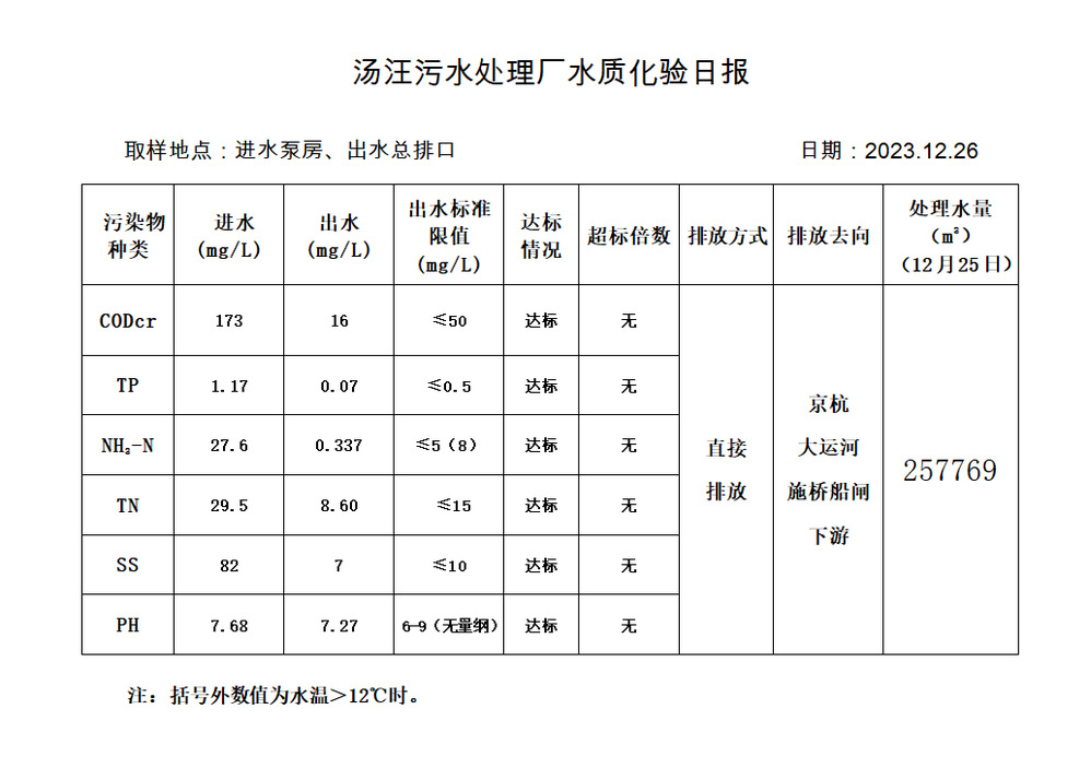 汤汪污水处理厂水质化验日报(2023.12.26)