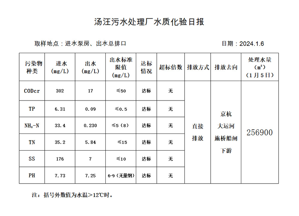 汤汪污水处理厂水质化验日报(2024.1.6)