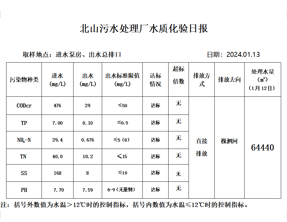 北山污水处理厂水质化验日报(2024.1.13)