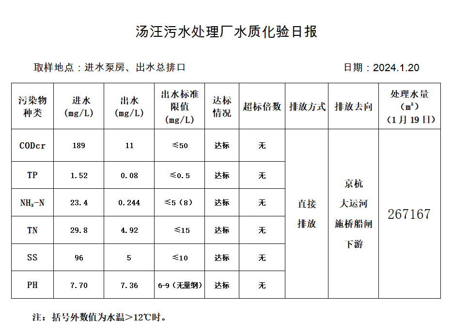 汤汪污水处理厂水质化验日报(2024.1.20)