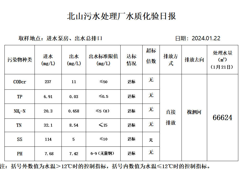北山污水处理厂水质化验日报(2024.1.22)