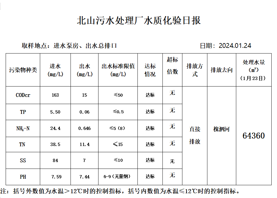 北山污水处理厂水质化验日报(2024.1.24)