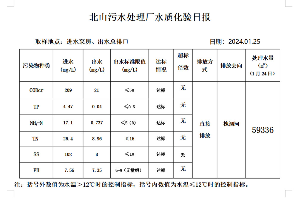 北山污水处理厂水质化验日报(2024.1.25)