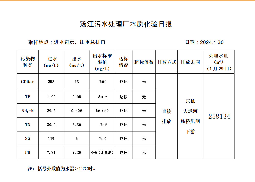汤汪污水处理厂水质化验日报(2024.1.30)