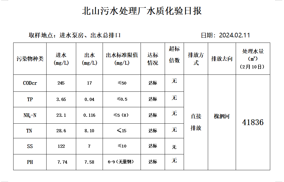 北山污水处理厂水质化验日报(2024.2.11)