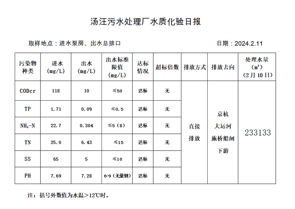 汤汪污水处理厂水质化验日报(2024.2.11)