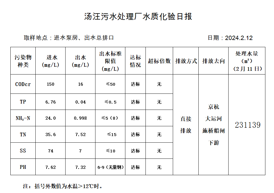 汤汪污水处理厂水质化验日报(2024.2.12)