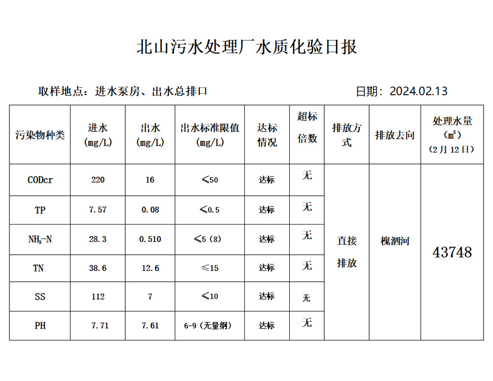 北山污水处理厂水质化验日报(2024.2.13)