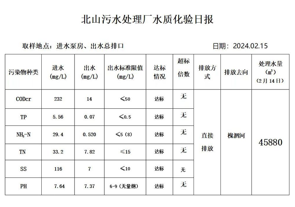 北山污水处理厂水质化验日报(2024.2.15)