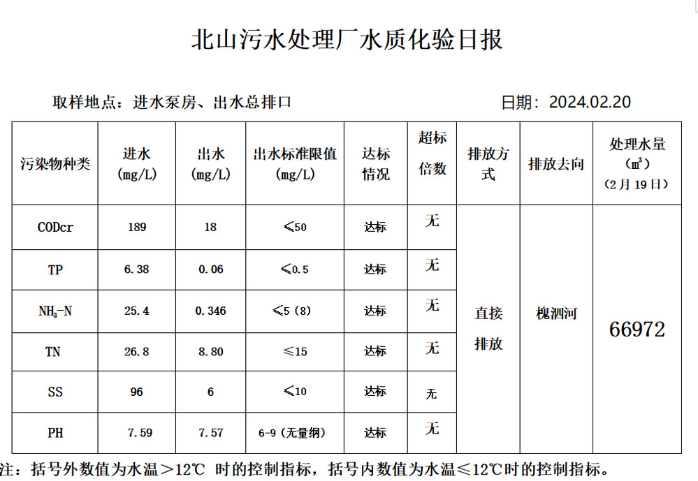 北山污水处理厂水质化验日报(2024.2.20)