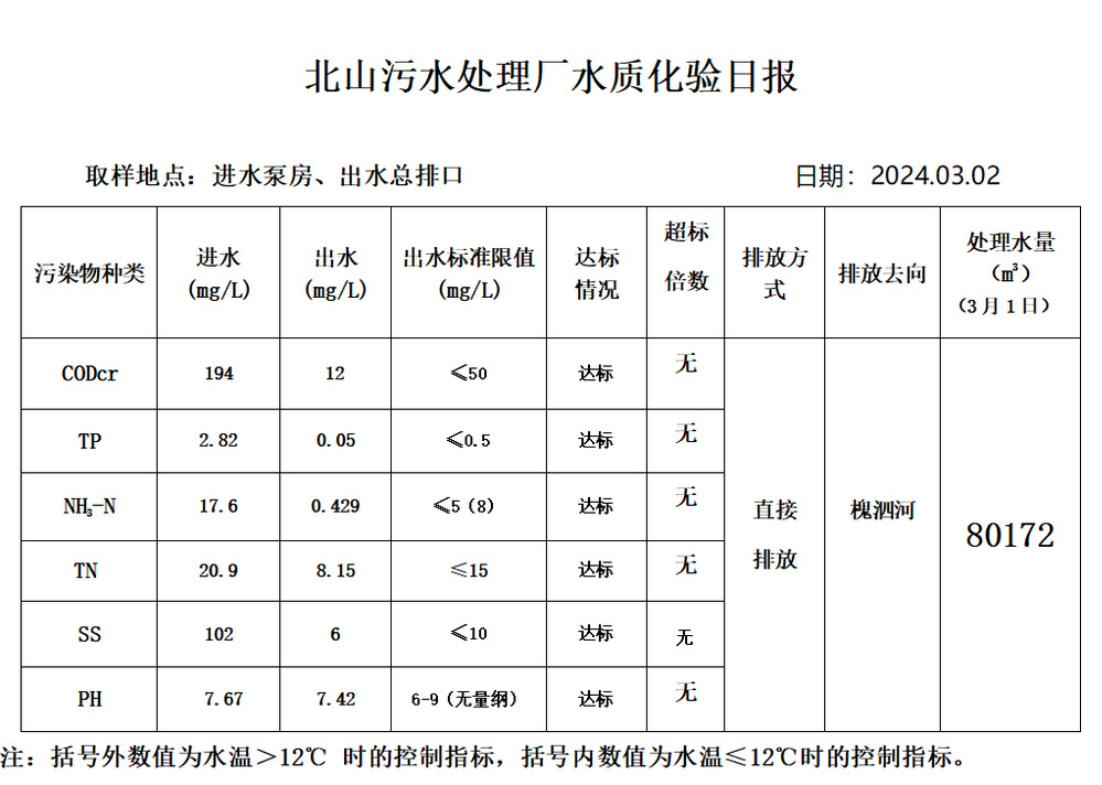 北山污水处理厂水质化验日报(2024.3.2)