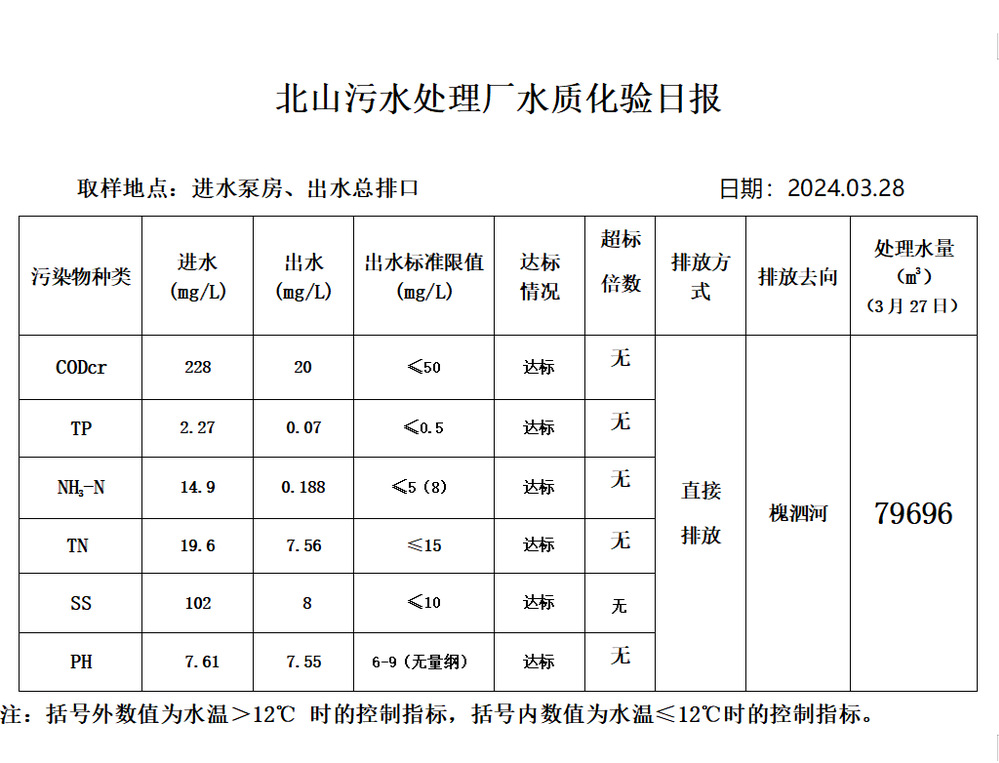 北山污水处理厂水质化验日报(2024.3.28)