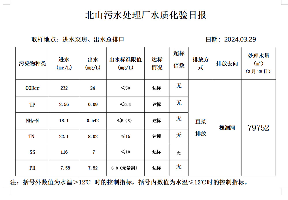 北山污水处理厂水质化验日报(2024.3.29)