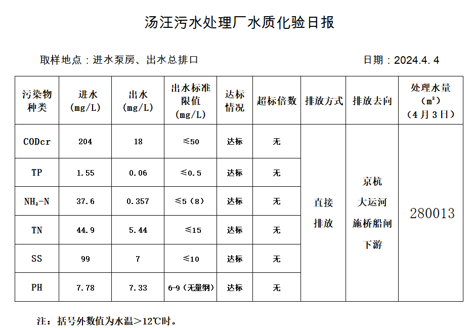 汤汪污水处理厂水质化验日报(2024.4.4)