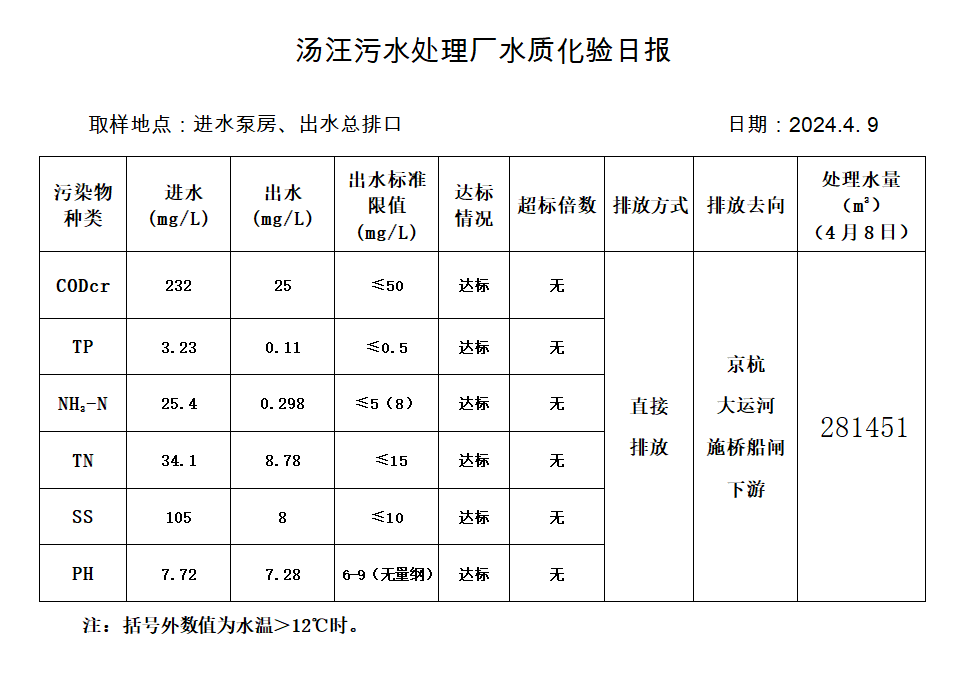 汤汪污水处理厂水质化验日报(2024.4.9)