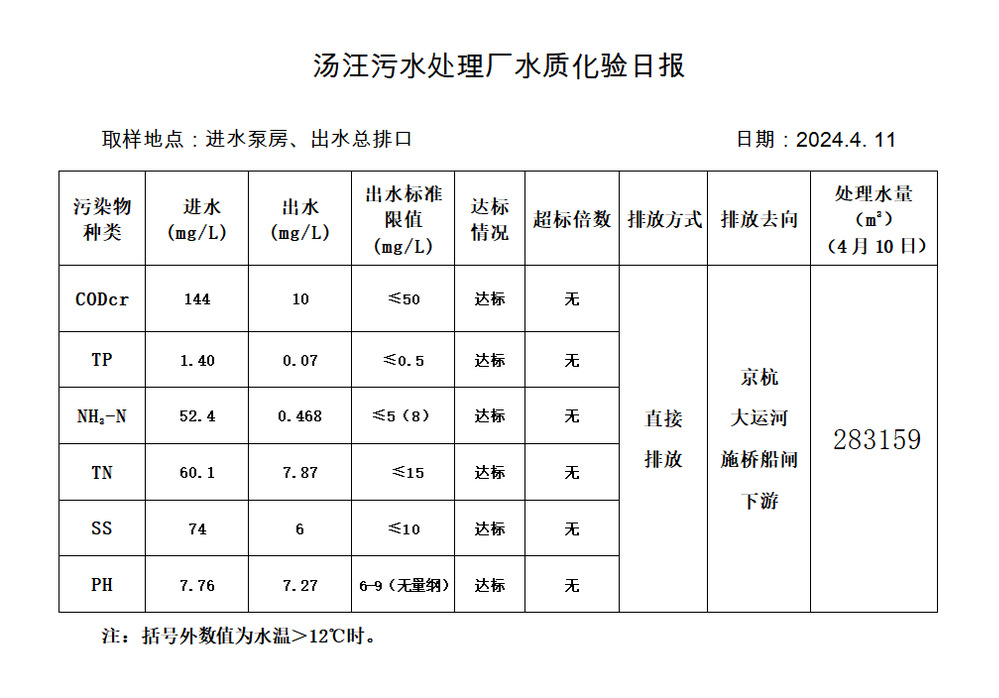 汤汪污水处理厂水质化验日报(2024.4.10)