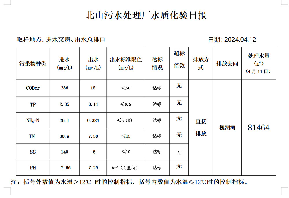 北山污水处理厂水质化验日报(2024.4.12)