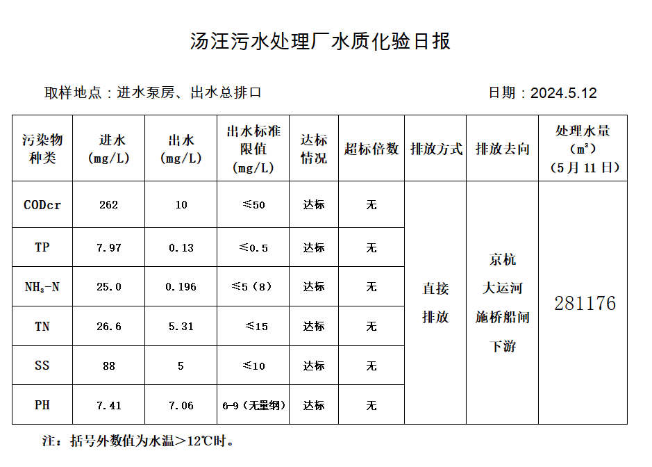 汤汪污水处理厂水质化验日报(2024.5.12)