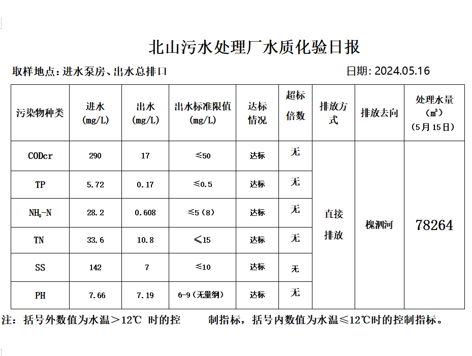 北山污水处理厂水质化验日报(2024.5.16)