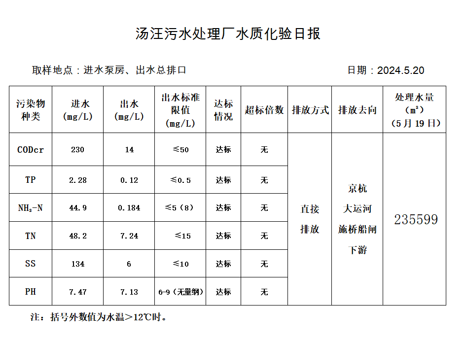 汤汪污水处理厂水质化验日报(2024.5.20)