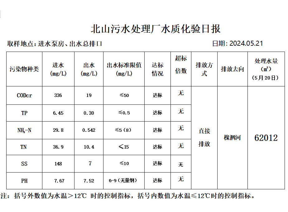 北山污水处理厂水质化验日报(2024.5.21)