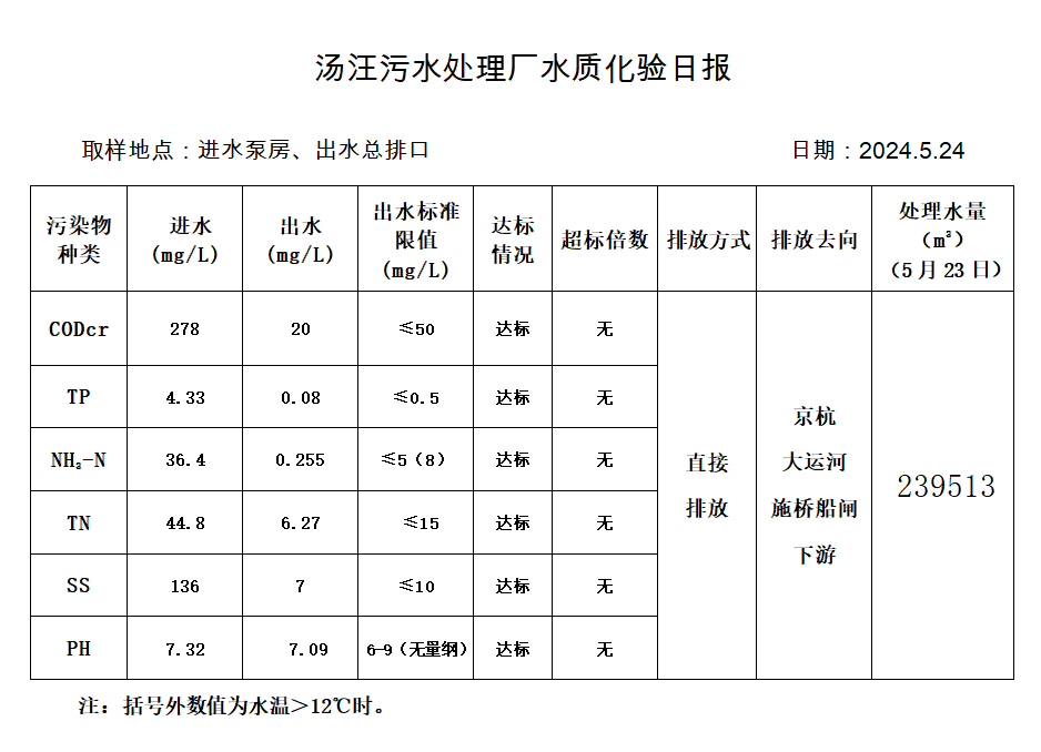 汤汪污水处理厂水质化验日报(2024.5.24)