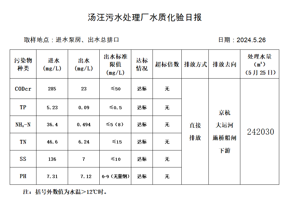 汤汪污水处理厂水质化验日报(2024.5.26)