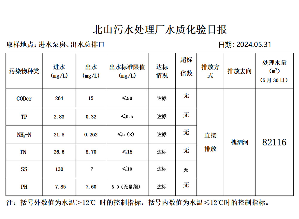 北山污水处理厂水质化验日报(2024.5.31)