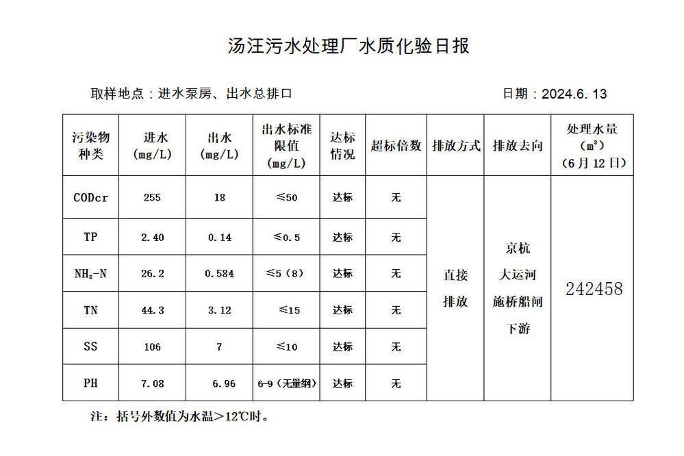汤汪污水处理厂水质化验日报(2024.6.13)