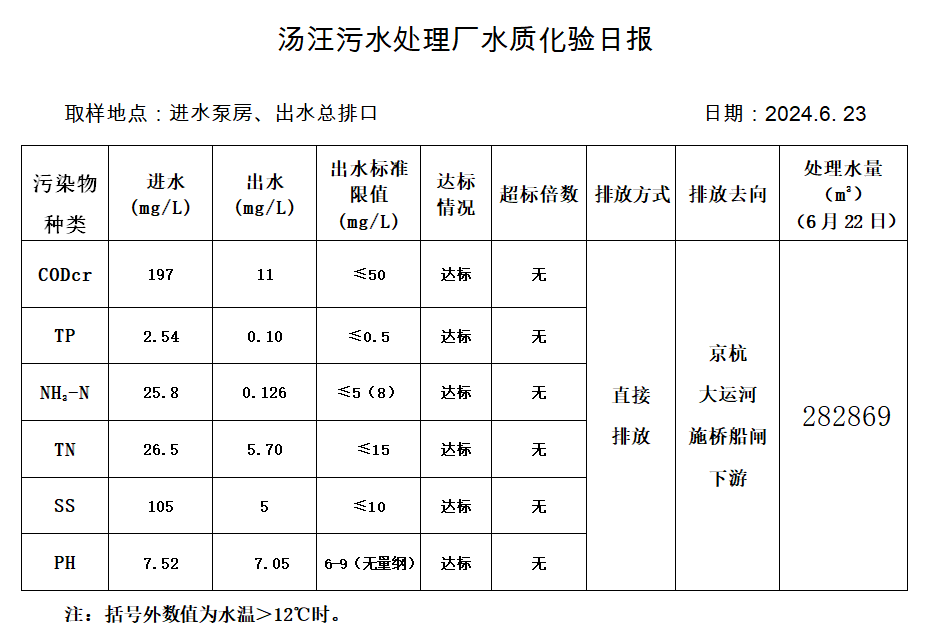 汤汪污水处理厂水质化验日报(2024.6.23)