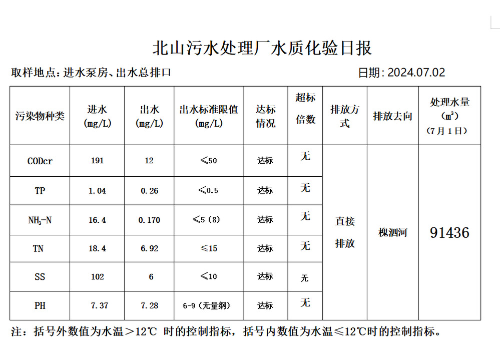 北山污水处理厂水质化验日报(2024.7.2)