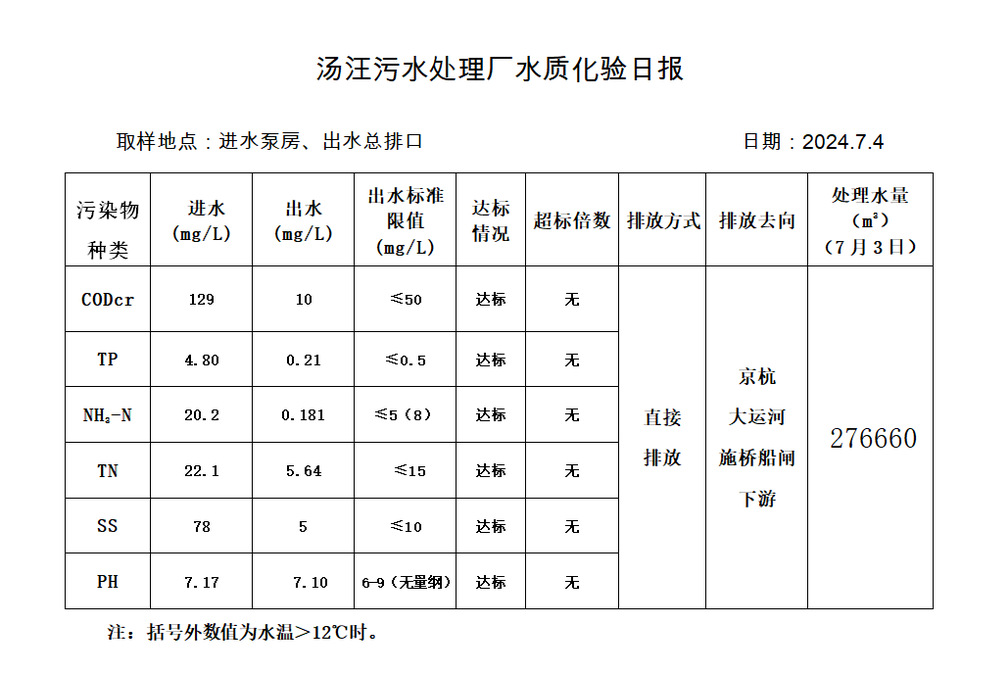 汤汪污水处理厂水质化验日报(2024.7.4)