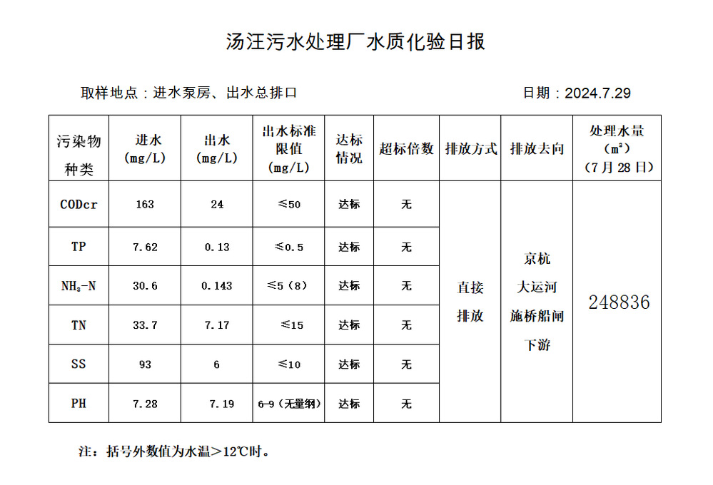 汤汪污水处理厂水质化验日报(2024.7.29)