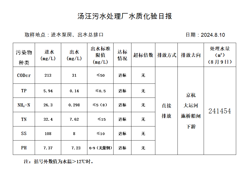 汤汪污水处理厂水质化验日报(2024.8.10)