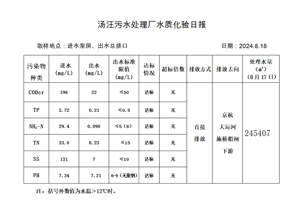 汤汪污水处理厂水质化验日报(2024.8.18)