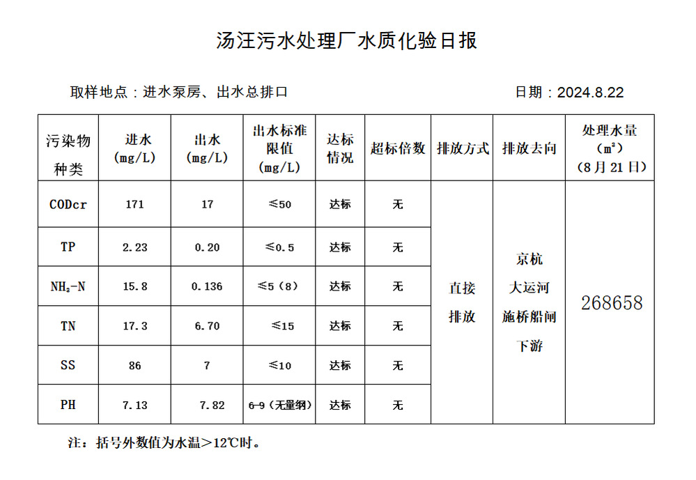 汤汪污水处理厂水质化验日报(2024.8.22)