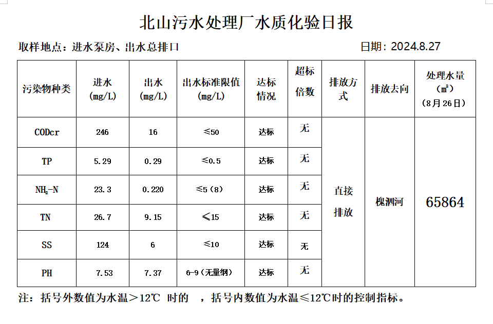 北山污水处理厂水质化验日报(2024.8.27)