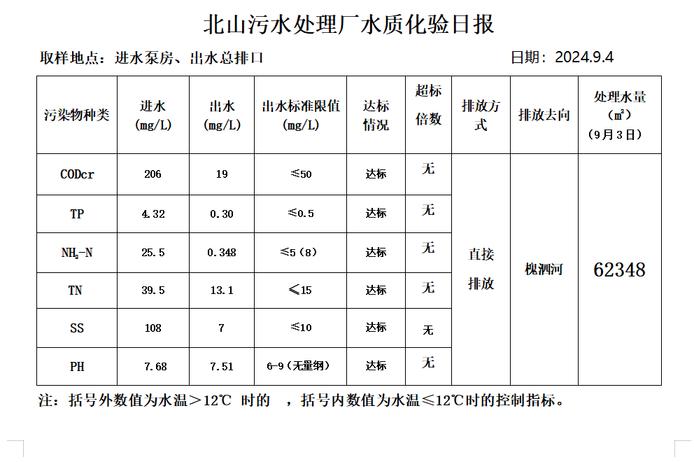 北山污水处理厂水质化验日报(2024.9.4)